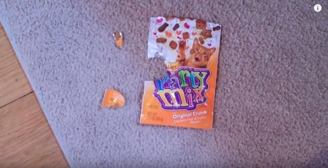 飼い主さんが帰ってくると、留守の間に誰かがニャンコのお菓子を荒らしていたのでした。
