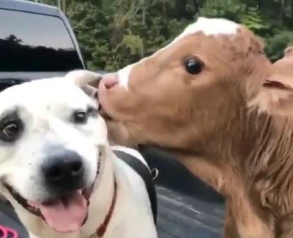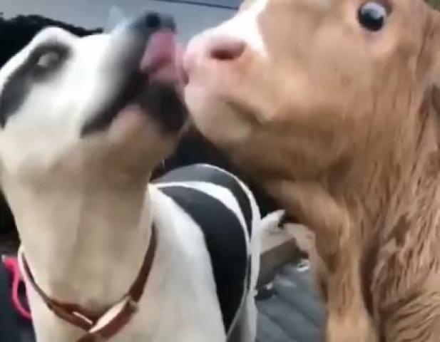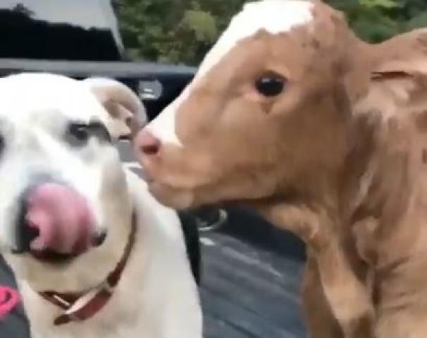 ワンコが子牛をベロベロと舐めています。