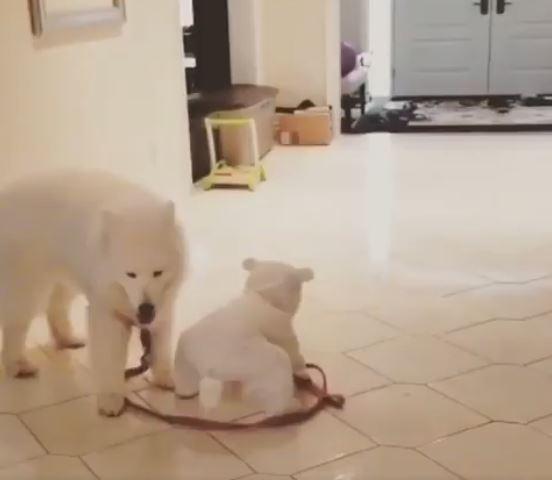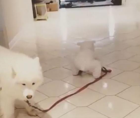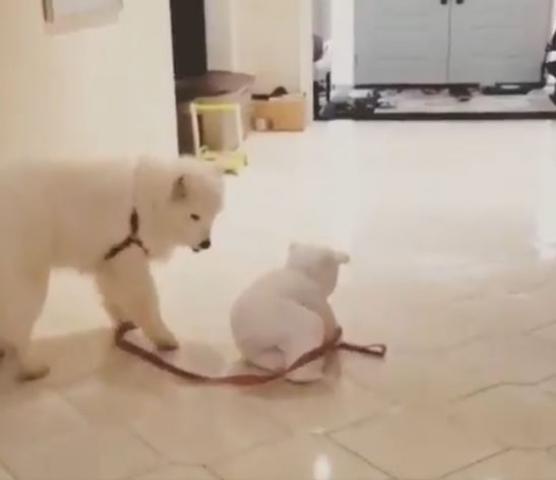 Tiny icebear baby walking with huge white dog ...