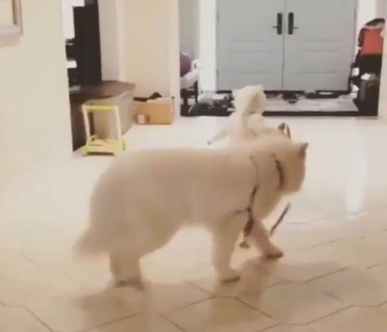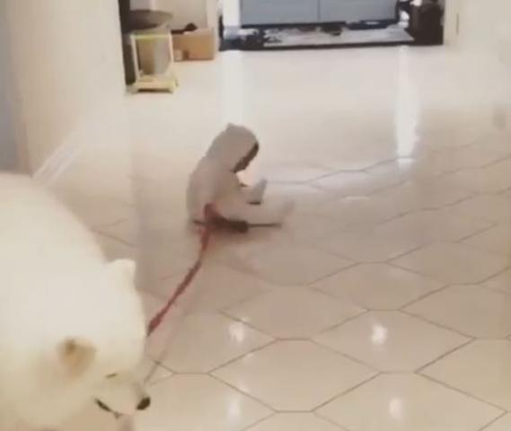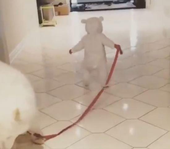 歩き始めたばかりのヒトの赤ちゃんがついでに犬のお散歩を学んでみます。