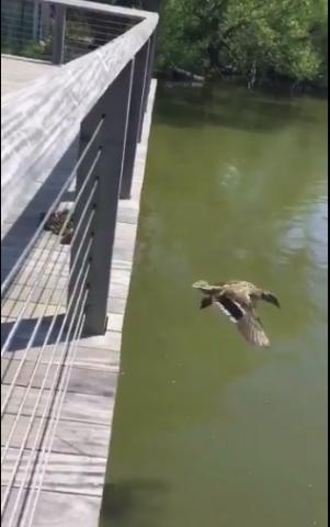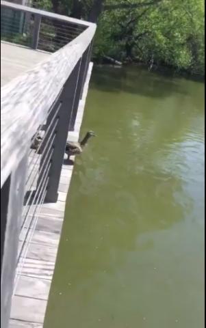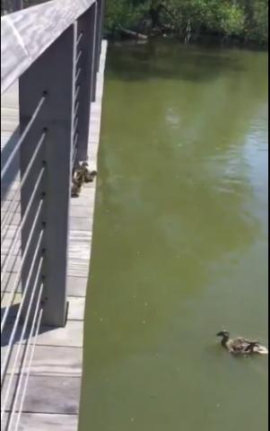 親カモが「こうするのよ!」と言わんばかりに飛び降りました。