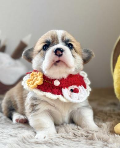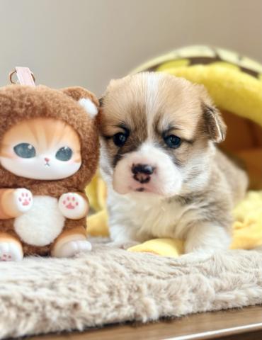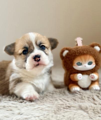| その他 | パパ犬がフラッフィーのため、成犬後は通常より毛が長くなると予想されます。 希少な毛色フォーン&ホワイト、レッドやセーブルと比べて淡く、優しい色合いをしています。 今現在体やお顔周りの黒っぽい差し毛は成長と共に生え変わり綺麗なクリーム色になります。 お口周りの黒さもまだ目立ちますが、成長と共に色は薄めになっていきますので自然なお色になるかと思います。 成長と共にお鼻も黒くなっていきます。 |